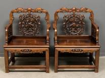 Paar Chinese padoek armstoelen, de rug met opengewerkt decor van bloemen, vogels en wolken, de kussens met drakendecor, midden 20e eeuw, 90 x 68 x 52 cm