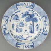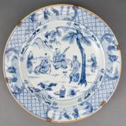 Chinees porseleinen schotel met blauw-wit decor van musicerende figuren, de rand met servetwerk en vier cartouches met vissers, Kangxi -twee haarlijnen-, Ø 39 cm