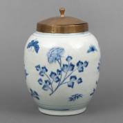 Chinees porseleinen pot met blauw-wit decor van vier verschillende bloemen en vlinders, Transition, voorzien van koperen montuur en deksel -krassen en butsjes in het glazuur, deksel en montuur van later datum-, 30 x Ø 22 cm