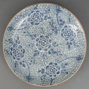 Chinees porseleinen schotel met vol blauw-wit bloemdecor, 18e eeuw -haarlijn en enkele randchipjes-, Ø 35 cm