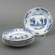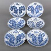 Zes Chinees porseleinen borden met blauw-wit decor: lange lijzen in tuin, Kangxi -twee borden haarlijn, alle kleine randschilfers-, Ø 21 cm