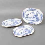 Drie grote rechthoekige Chinees porseleinen serveerschotels met afgeschuinde hoeken en blauw-wit decor van herten, en een bijbehorende kleiner formaat serveerschotel, Qianlong -alle met randchips en -schilfers-, 36 x 27,5 cm