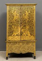 Zwart en goud lakwerk manuscriptkabinet met twee deuren en twee laden, op de deuren een voorstelling van de olifantenstrijd van koning Naresuan, Thailand, 148 x 82 x 51 cm