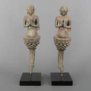 Paar gepatineerd bronzen attendanten, gezeten op lotusbloemen, Thailand -inclusief standaarden-, 60 x 16 x 22 cm