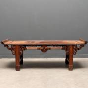 Lage padoek salontafel met ajourwerk onder het tafelblad, China, 20e eeuw -tafelblad deels verkleurd, gebruikssporen-, 44 x 125 x 40 cm