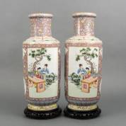 Paar Chinees porseleinen famille rose vazen, met decor van figuren in cartouches omringt door millefleurs, staand op gesneden houten basementen, Qianlong gemerkt, 20e eeuw, 47 cm