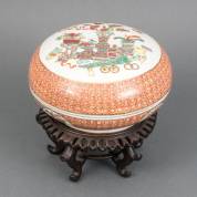 Chinese porseleinen famille rose dekseldoos met bloemenvaasdecor, Kangxi gemerkt, 19e eeuw, op houten basement, 13,5 x Ø 24,5 cm