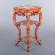 Kleine vierkante padoek bijzettafel met roze marmeren blad, de poten in de vorm van takken uitlopend in pruimenbloesem en voorzien van étagère, 37 x 19 x 19 cm