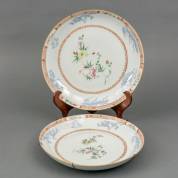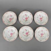 Serie van zes Chinees porseleinen famille rose diepe borden met floraal decor, 18e eeuw -randschilfers-, Ø 23 cm