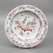 Chinees porseleinen famille rose diepe schotel, decor: bloemenvaas, stoel, en tafel met diverse voorwerpen, Yongzheng/Qianlong, Ø 36 cm