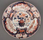 Grote Japans porseleinen Imari schotel met centraal decor: bloemenmand, de rand met vogels en bloemen, circa 1700 -gerestaureerd-, Ø 47 x 8 cm