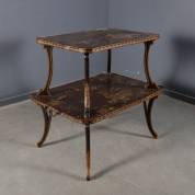 Zwart lakwerk houten étagèremeubel met deels verguld Japonistisch reliëfdecor: vogels in landschap, Frankrijk, circa 1900 -fineer van de randen uitgezet en met defecten, lakwerk sleets en op enkele plaatsen defect-, 80 x 81 x 60 cm