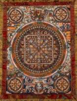 Fijn geschilderde Nepalese thangka: mandala met centraal een dharmapala in yab yum, vermoedelijk Vajrabhairava, omringd door vele figuren, naga en scènes, lijmverf op doek, circa 1900, in originele floraal gedecoreerde behanging, 45 x 33 cm