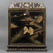 Chinees zwart lakwerk kastje, achter de klep bevinden zich vijf laatjes, 20e eeuw -sleutel niet aanwezig-, 47 x 39,5 x 39 cm