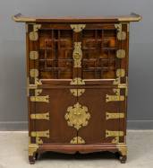 Tweedelig houten medicijnkastje met messing beslag in de bovenkast twee opengewerkte deurtjes met daarachter 18 lades, in de onderkast twee deurtjes, Korea, midden 20e eeuw, 88 x 72 x 30 cm