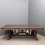 Hardhouten tafel, de regels onder het tafelblad ingelegd met parelmoer, het onderstel voorzien van rijk draai- en snijwerk, 20e eeuw, 82 x 241 x 110 cm