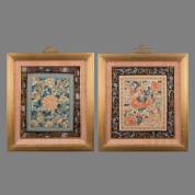 Twee ingelijste geborduurde zijden doeken met decor van bloemen, vlinders en kostbaarheden, China, 20e eeuw, 40 x 33,5 en 40 x 35,5 cm