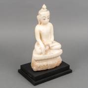 Kleine albasten Boeddha, zittend in maravijaya, de handen in bhumisparsha mudra, resten van zwarte verf in haar, op gezwart houten basement, Birma, vermoedelijk laat 18e eeuw, 36,5 cm