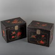 Paar Aziatische lakwerk dozen met rood bloem- en vogeldecor op zwart fond, de paktong sluitingen met gegraveerd bladmotief -defecten-, 25,5 x 31 x 22 cm