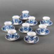Negen Japans porseleinen kommen en schotels met blauw-wit decor van lange lijzen, gemerkt, 19e eeuw -één schoteltje gerestaureerd-, 8 x Ø 12,5 cm