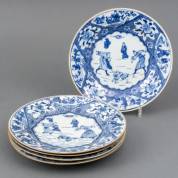 Vijf Chinees porseleinen dubbelborden met blauw-wit decor van een scène met vijf figuren, waarvan de centrale figuur aangevallen wordt, de rand met waaiervormige cartouches, Yongzheng/Qianlong -vier borden met haarlijnen, waarvan één exemplaar met randchip-, Ø 25,25 cm