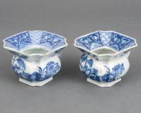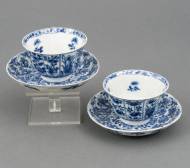 Paar Chinees porseleinen kommetjes en schoteltjes met blauw-wit bloemdecor, gemerkt, Kangxi -één schoteltje met randschilfer-, 6 x Ø 12,5 cm