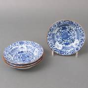 Vier Chinees porseleinen papbordjes met blauw-wit bloemdecor, Yongzheng/Qianlong -één met haarlijn-, 4 x Ø 16 cm