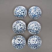 Zes Chinees porseleinen borden met blauw-wit decor en vakverdeling, centraal twee kemphanen, Wanli-stijl, 18e eeuw -alle met randschilfers, één met haarlijn en één met chip en haarlijn-, Ø 22,5 cm