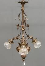 Bronskleurige kroonlamp met drie kristallen kapjes, begin 20e eeuw, 95 x Ø 60 cm