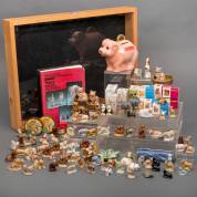 Verzameling porseleinen beeldjes, catalogus: 'Wade Whimsical Collectables', 1995, lege doosjes, en spaarvarken, uitvoering Wade, Engeland, daarbij: tafelvitrine