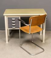Grijsgelakt stalen bureau met linoleum werkblad en vier lades, ontwerp André Cordemeijer, uitvoering Gispen, circa 1960 -blad gebruikssporen-, daarbij: verchroomde buisframe armstoel met houten rug en zitting, model 208, uitvoering Gispen, 71 x 95 x 51 cm