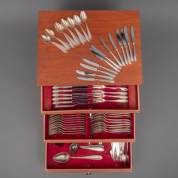 Verzilverd bestekgedeelte, parelrand, in houten cassette, uitvoering WMF, bestaande uit: dertien tafellepels, acht tafelvorken, vijf tafelmessen, zeven dessertlepels, twaalf dessertvorken, twaalf dessertmessen, twaalf toespijslepels, vier cakevorkjes, twaalf fruitmessen, zes viscouverts, en twaalf diverse dienvorken en -lepels -gebruikssporen-