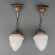 Paar witte persglazen hanglampjes met messing monturen, 38 x Ø 12 cm