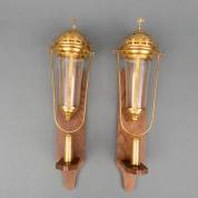Paar messing processielampen op eiken wandsteunen, circa 1900, België/Frankrijk, 50 x 15 cm