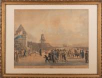 Gravure: 'Luisterryke vrouwen schaatsen rydparty, gehouden te Leeuwarden op den 1sten en 2den February des Jaars 1805' -gebruind, vlekjes-, 39 x 49 cm