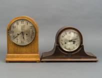 Schoorsteenklok in donkergebeitste eiken kast, adres Junghans, daarbij: tafelklok in eiken kast, 31,5 cm