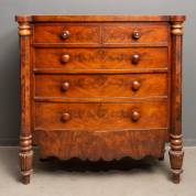 Mahonie bow-front ladekast, de ladetrekkers met parelmoer inleg, Engeland, 19e eeuw -gebruikssporen en defecten-, 133 x 130 x 53 cm