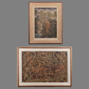 Indonesische School, twee werken: Balinese schone bezoekt de rivier, acrylverf op doek, onduidelijk gesigneerd -craquelé, scheurtje in rechterbovenhoek-, en een demonengevecht in fantasielandschap, acrylverf op doek, niet gesigneerd -doek verweerd-, 32 x 23 en 44 x 64,5 cm