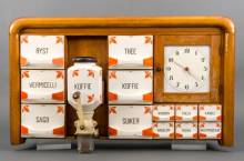 Houten keukenwandrek met aardewerk kruidenlades met opschrift, elektrische klok en koffiemolen -defecten-, 47 x 77 x 30 cm