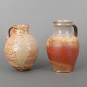 Joop Cromvoets (1952), grote grijs-bruingeglazuurde keramiek schenkkan, gemerkt, daarbij: bruin-beigegeglazuurde keramiek schenkkan, onduidelijk gemerkt, 28 x Ø 20 en 30 x Ø 22cm