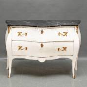 Witgeschilderde commode met zwart marmeren blad, de twee laden van de gebombeerde kast met bronzen beslag, Louis Quinze-stijl -overgeschilderd en veel reparaties-, 86 x 121 x 49 cm