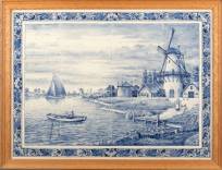 Twaalfpas Delfts aardewerk tegeltableau met blauw-wit decor: molen aan het water in de polder, 20e eeuw, 50 x 65 cm