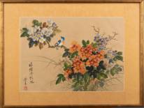Chinese schildering op zijde: vogel tussen de bloemen, gesigneerd Fang Yue, modern, 30 x 42 cm
