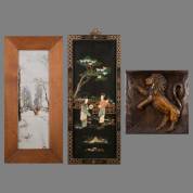 Aardewerk driepas tegeltableau met polychroom winterlandschapsdecor, Plateelbakkerij Delft, Chinese wandplaquette met halfedelsteen ingelegd, en gesneden houten reliëf: leeuw