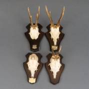 Vier reebokgeweitjes, op houten wandplaten