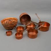 Zevendelige koperen steelpannenset, Frankrijk, en grote koperen tulbandvorm -niet vertind-, 15 x Ø 28 cm