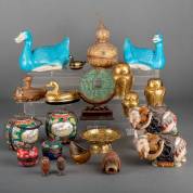 Twee azuurblauwgeglazuurde porseleinen eenden, diverse houten eenden, olifantenbeeldjes, etc., alle in Aziatische stijl -defecten-