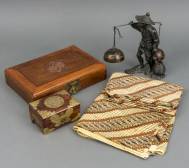Batikdoek, midden 20e eeuw, twee houten kistjes met bronzen beslag en tinnen beeldje, visser, Japan, circa 1900