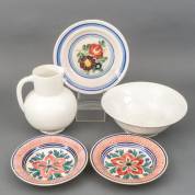 Drie aardewerk borden met bloemdecor en wit aardewerk lampetstel -defecten-, 25 cm