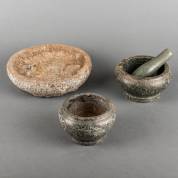 Eén grote en twee kleinere granieten vijzels, met één stamper